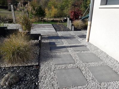 Pour la réalisation de ces aménagements, nous utilisons des dalles en pierre naturelle ou reconstituée, du grés céram, de l’enrobé ou encore du bois.